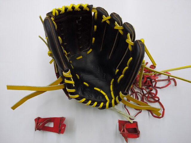 指かけ、革紐の全てを赤色から黄色に張り替えしました。